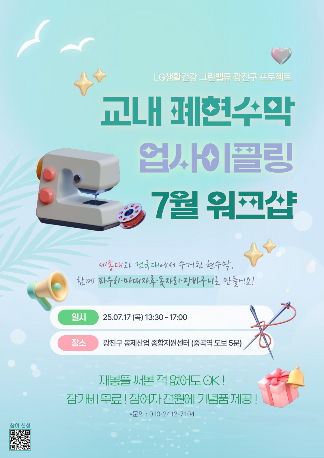 • 모집기간 : 7/11(금) 오전 10:00 ~ (선착순 마감)• 참가비 : 무료• 모집인원 : 세종대·건국대 소속 인원 또는 광진구민 선착순 3인 (만14세 이상)• 참여 혜택 : 다과 및 기부한 현수막으로 제작한 새활용품(파우치, 돗자리, 장바구니 등) 제공※원치 않을 경우, 대학본부에 기부 가능
